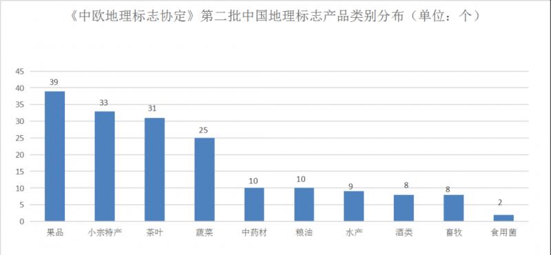獲得互認(rèn)互保的首批100個中國地理標(biāo)志產(chǎn)品,既有已對歐盟出口產(chǎn)品的婺源綠茶、吐魯番葡萄干,也有對歐盟具有出口潛力的煙臺蘋果、安岳檸檬等。第二批175個中國地理標(biāo)志產(chǎn)品,果品、小宗特產(chǎn)、茶葉產(chǎn)品最多,分別有39個、33個、31個,其他類別依次是蔬菜、中藥材、糧油、水產(chǎn)、酒類、畜牧和食用菌,這些地理標(biāo)志產(chǎn)品將在四年后獲得保護(hù)。
