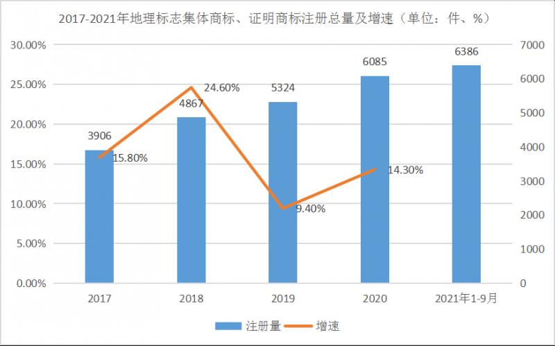《國家知識產(chǎn)權(quán)局統(tǒng)計年報》顯示,2017年-2021年三季度末,地理標(biāo)志作為集體商標(biāo)、證明商標(biāo)累計注冊量從3906件,上升到6386件,其中,2021年1-9月份,地理標(biāo)志集體商標(biāo)、證明商標(biāo)新增注冊301件。從2017年-2021年三季度末,地理標(biāo)志集體商標(biāo)、證明商標(biāo)不到五年時間注冊量上升接近40%,其中,2017年增長率為15.8%,2018年增長率為24.6%,2019年增長率為9.4%,2020年增長率為14.3%。