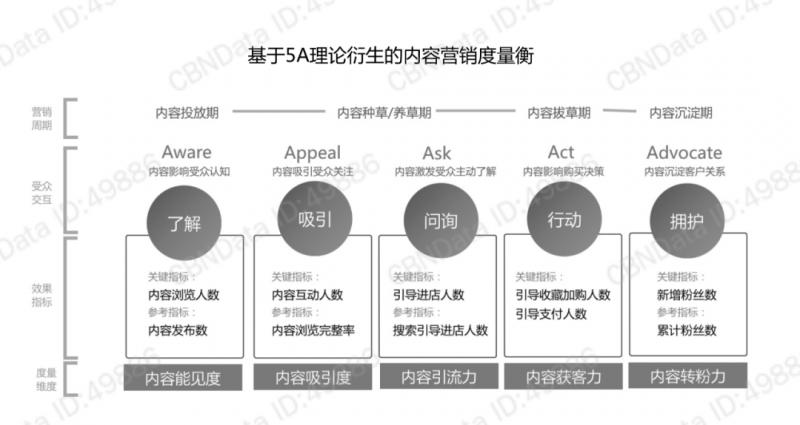該體系以“現代營銷之父”菲利普·科特勒的“5A客戶行為路徑”為理論基礎,梳理出內容能見度、內容吸引度、內容引流力、內容獲客力、內容轉粉力共5個維度的數據指標。