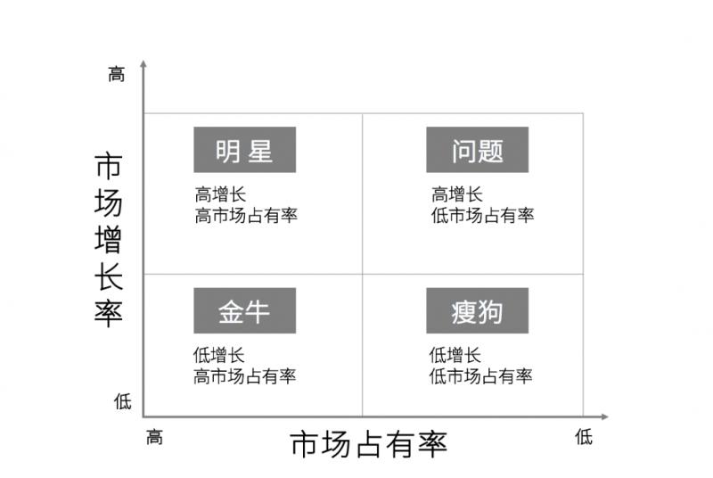 以市場占有率為橫坐標,市場增長率為縱坐標的矩陣坐標圖,將坐標圖劃為四個象限,分別為:明星產品、金牛產品、問題產品、瘦狗產品。