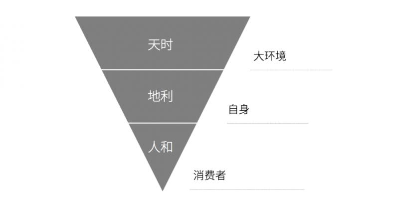 在做任何企業戰略時,都需要考慮天時(市場面對的大環境),不能逆天而行。地利(企業自身能力),我方是否有占據地勢優勢。人和(消費者需求),我們做出來的產品是否可得人心。