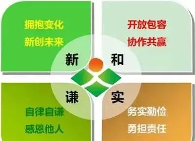新希望六和的核心價值觀釋義:新是創新,和是聚和,實是務實,謙是自謙。