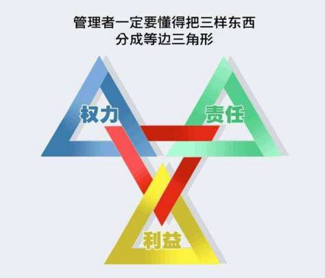管理者一定要懂得把三樣?xùn)|西分成等邊三角形:即權(quán)力、責(zé)任、利益三角對等。