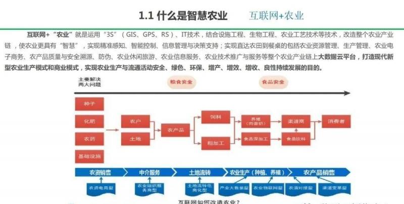 互聯(lián)網(wǎng)+“農(nóng)業(yè)”就是運用“3S”(GIS、GPS、RS)、IT技術,結合設施工程、生物工程、農(nóng)業(yè)工藝技術等技術,改造整個農(nóng)業(yè)產(chǎn)業(yè)鏈 ,使農(nóng)業(yè)更具有“智慧”,實現(xiàn)精準感知、智能控制、信息管理與決策支持;實現(xiàn)直達農(nóng)田到餐桌的包括農(nóng)業(yè)資源管理、生產(chǎn)管理、農(nóng)業(yè)電子商務、農(nóng)產(chǎn)品質(zhì)量與安全溯源、防偽、農(nóng)業(yè)休閑旅游、農(nóng)業(yè)信息服務、農(nóng)業(yè)技術推廣與服務等整個農(nóng)業(yè)產(chǎn)業(yè)鏈上大數(shù)據(jù)云平臺,打造現(xiàn)代新型農(nóng)業(yè)生產(chǎn)模式和商業(yè)模式,實現(xiàn)農(nóng)業(yè)生產(chǎn)與流通活動安全、綠色、環(huán)保、增產(chǎn)、增效、增收、良性持續(xù)發(fā)展的目的。