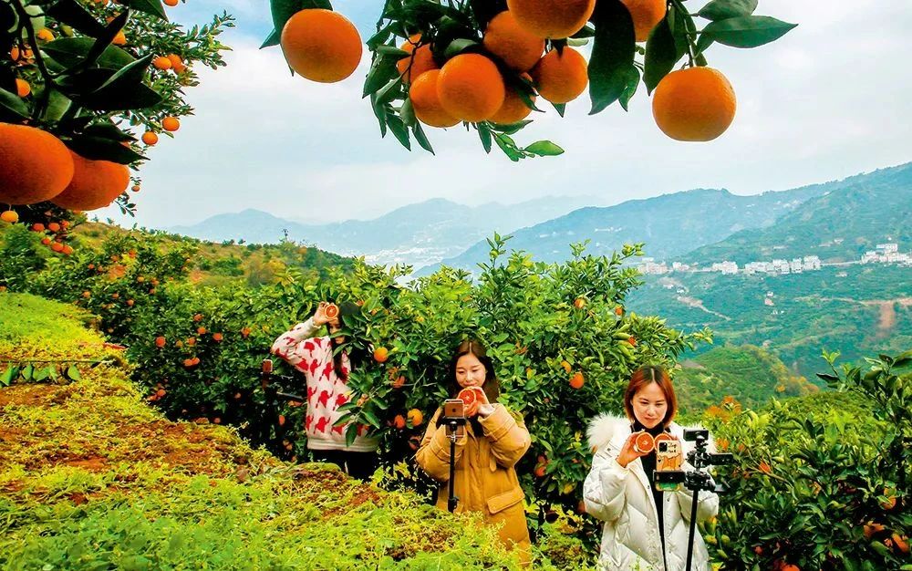 ▲ 2021年12月4日,湖北秭歸的電商主播在郭家壩鎮擂鼓臺村的生態柑橘園直播推介紅肉臍橙 王罡攝