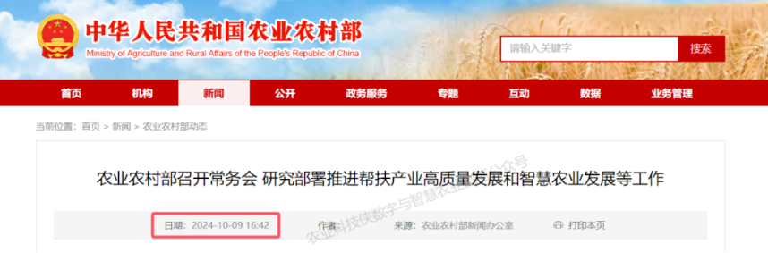 10月9日,農業農村部黨組書記、部長韓俊主持召開部常務會議,審議并原則通過《農業農村部關于落實“四個一批”要求扎實推進幫扶產業高質量發展的指導意見(送審稿)》《農業農村部關于增強內生動力提升發展能力促進脫貧群眾增收致富和脫貧地區高質量發展的意見(送審稿)》《農業農村部關于大力發展智慧農業的指導意見(送審稿)》以及《全國智慧農業行動計劃(2024—2028年)(送審稿)》。