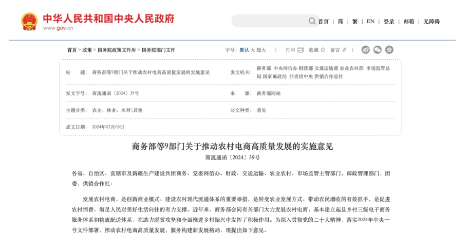 近日,商務(wù)部等9部門(mén)聯(lián)合印發(fā)《關(guān)于推動(dòng)農(nóng)村電商高質(zhì)量發(fā)展的實(shí)施意見(jiàn)》(以下簡(jiǎn)稱(chēng)《意見(jiàn)》),提出農(nóng)村電商高質(zhì)量發(fā)展5年新目標(biāo)和打造縣域直播電商基地、培育農(nóng)村數(shù)字消費(fèi)場(chǎng)景等14條具體政策舉措。