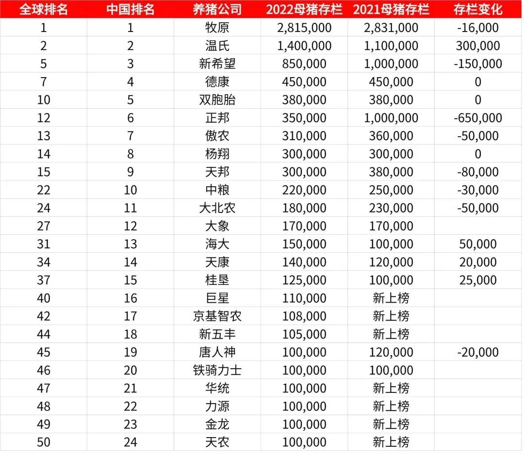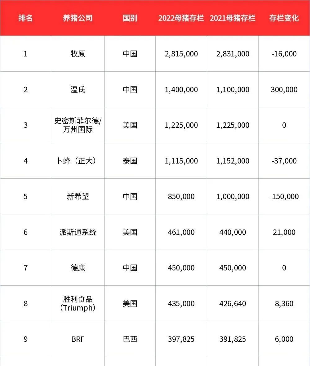 榜單總共涵蓋8個國家的50個公司共16,642,592頭母豬,其中中國24家、美國12家、巴西4家、西班牙3家、俄羅斯3家、泰國2家、韓國1家、智利一家。