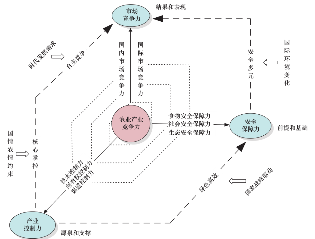 產業控制力指一國對本國產業的核心技術、資本、渠道、品牌等具有足夠的控制或主導能力,在對外開放競爭中不因依賴其他國家農產品供給而損害產業自主獨立性,不因國際農產品市場價格波動、外資競爭沖擊而影響農產品供給與經濟社會持續發展;作為新階段農業產業競爭力的源泉和支撐,是有效抵御并抗衡外部不利因素和風險沖擊的能力(見圖 1)。產業控制力體現在三方面: