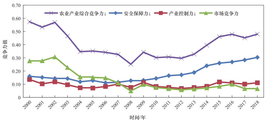 圖 2 農業產業各維度競爭力及綜合競爭力的變化情況(2000—2018 年)