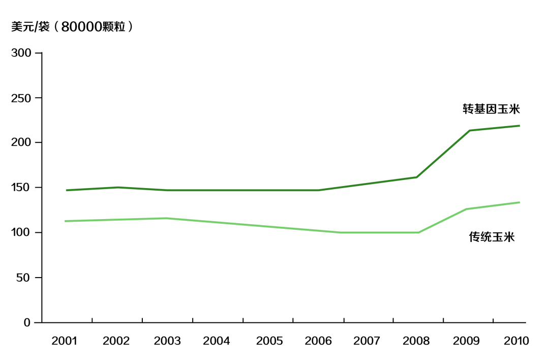 不過,值得一提的是,轉基因作物包含大量的技術專利費,價格往往比常規作物的種子高。據美國農業局2001年至2010的數據可知,十年內轉基因玉米和傳統玉米的價格差距浮動不大,總體保持在2倍左右。由此也可推出,近年來轉基因玉米種子價格大概為非轉基因玉米種子2倍。
