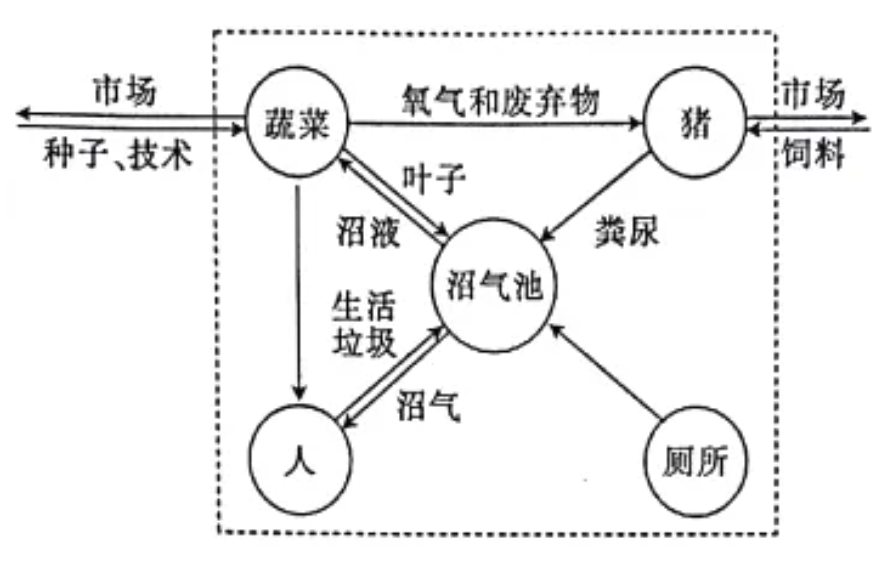 2. 南方的“豬—沼—果”生態農業模式,利用山地、大田、庭院,建設畜禽舍、果園、沼氣池,同樣以沼氣為中心,用于解決農村生活用能,果園套種飼料作物,用于畜禽養殖飼料需求。