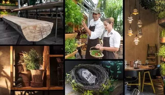餐廳設計師是想捕捉溫室的感覺,沒有所謂的主題。因此,在這里你能感受到混合式的復古靈感(比如用罐子做的餐桌腳),也能看到有機材料(比如浮木吊燈和網狀 John Vogel 椅子),還能捕捉到種工業時代的痕跡,比如工業風凳子、風扇、暴露在外的管道。