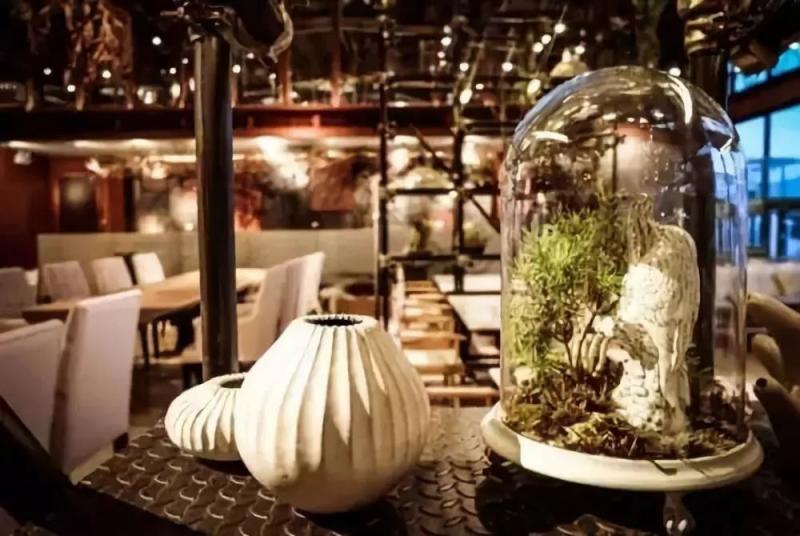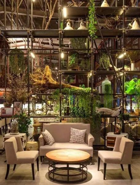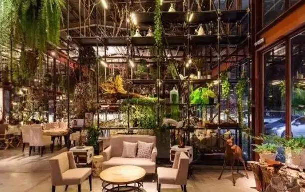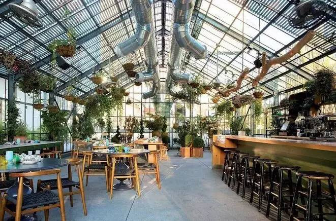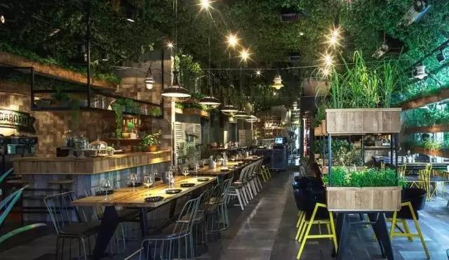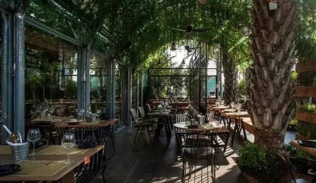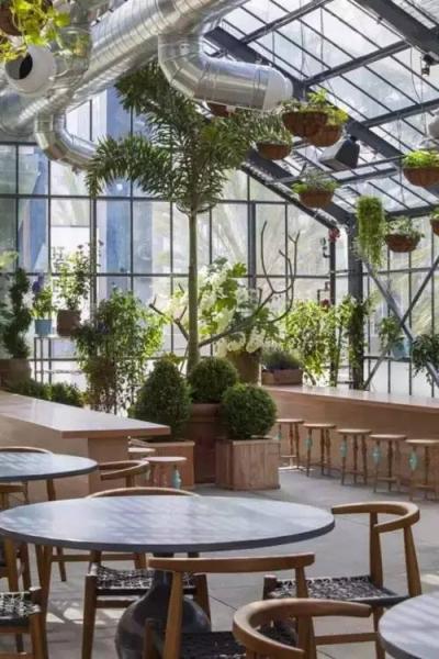 這個郁郁蔥蔥充滿生命力的餐廳從地面、墻面,到天花板都妝點了植物,創造出一個生機盎然的、一個玻璃容器般的溫室餐廳。