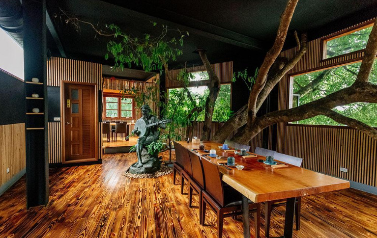 樹屋內部高 12 米,寬 10 米,中間圍繞樹干的是個酒吧,周圍擺著 5 張餐桌,最多只能容納 18 人就餐。四周的“墻”是通體落地的“百葉窗”。
