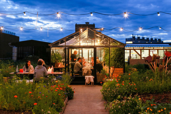 屋頂農場與餐廳,期盼將人們心中的高樓建筑,變成有溫度的地方。將冰冷的高樓建筑,蛻變成溫馨之地,設在玻璃溫室中的餐廳,浴著日光供應新鮮食材。