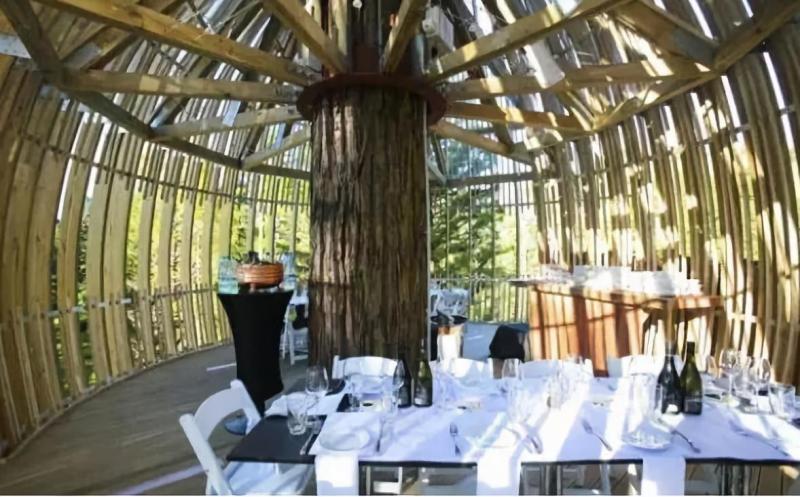 這家樹屋餐廳位于新西蘭最大的城市奧克蘭以北 60 公里的廣袤森林中。樹屋餐廳建在一棵高 40 米、直徑 1.7 米的巨大紅杉樹上。
