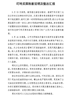 叮咚買菜也在微博上發布致歉說明及整改匯報,并表示:“歡迎消費者、媒體和監管部門前往我司前置倉檢查,并隨時提出改進意見。”但受該新聞的影響,叮咚買菜當晚美股盤前跌幅依然達到22.4%。