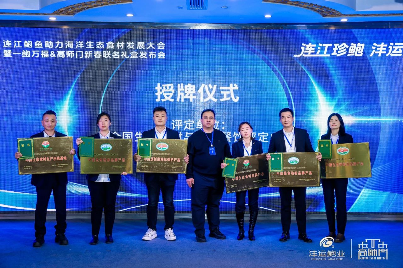 在會(huì)上,主辦方還舉行了兩項(xiàng)授牌儀式,其中經(jīng)全國(guó)生態(tài)食材與生態(tài)餐飲評(píng)定中心鑒定,授予福州源豐海洋科技有限公司“中國(guó)生態(tài)食材生產(chǎn)示范基地(源豐鮑魚(yú))”“中國(guó)美食地標(biāo)品牌產(chǎn)品(速凍鮑魚(yú))”“中國(guó)生態(tài)食材品牌產(chǎn)品(鹽磨鮑魚(yú))”“中國(guó)預(yù)制菜地標(biāo)保護(hù)產(chǎn)品(鮑汁鮑魚(yú))”“中國(guó)生態(tài)預(yù)制菜品牌產(chǎn)品(紅燒鮑魚(yú))”“中國(guó)美食地標(biāo)品牌產(chǎn)品(鮑魚(yú)大盆菜)”等榮譽(yù)稱號(hào);同時(shí),全國(guó)生態(tài)食材與生態(tài)餐飲評(píng)定中心常務(wù)副主任-于永濱還授予福州源豐海洋科技有限公司總經(jīng)理/張淑娟為【鄉(xiāng)村振興生態(tài)產(chǎn)品價(jià)值實(shí)現(xiàn)】推廣大使。