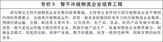 推動第三方冷鏈物流企業專業化發展、規模化經營和數字化轉型,著力培育具有較強國際競爭力的龍頭企業。加大冷鏈物流關鍵技術和先進裝備研發力度,鼓勵節能環保技術應用。推動建立冷鏈物流統計評價體系,準確掌握冷鏈物流基礎要素底數,及時客觀反映行業發展情況。完善冷鏈物流標準體系,強化國內國際標準對接。加大復合型冷鏈物流專業人才培養力度,壯大多層次冷鏈物流人才隊伍。