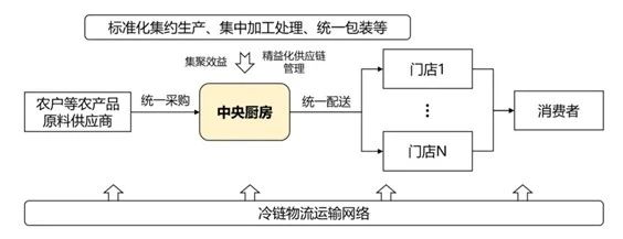 在我國不斷提高產業標準的大背景下,“中央廚房+冷鏈物流運輸網絡”的模式逐漸成為現代餐飲行業發展的新趨勢。規模化的中央廚房通過一致化采購、生產、配送等進行產業鏈細分并獲得集聚效益,并聯合農產品上下游優質供應商、渠道商以及冷鏈物流企業,打造以中央廚房為核心的精益化農產品供應鏈管理體系,既保證產品品質安全,又實現成本的降低。