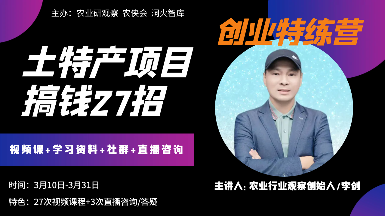 3月10日-3月3月31日 農(nóng)業(yè)行業(yè)觀察&農(nóng)俠會、洞火智庫推出一套系列土特產(chǎn)創(chuàng)業(yè)經(jīng)營特訓營課程(直播課),涵蓋土特產(chǎn)產(chǎn)品、品牌、商業(yè)、模式等課程采用視頻的方式幫助土特產(chǎn)老板或經(jīng)營者、管理者、創(chuàng)業(yè)者如何利用新模式、新思維、新商業(yè)搞錢,助力老板、創(chuàng)業(yè)者認知升級、思維升級。