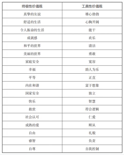 在此基礎(chǔ)上,羅克奇于 1973 年編制了一份價(jià)值觀調(diào)查表,包含終極性價(jià)值觀和工具性價(jià)值觀各 18 項(xiàng),用以調(diào)查人們的價(jià)值觀排序。如今這份調(diào)查表已經(jīng)成為國(guó)際上應(yīng)用廣泛的價(jià)值觀問(wèn)卷。