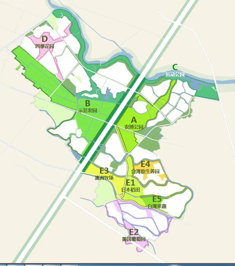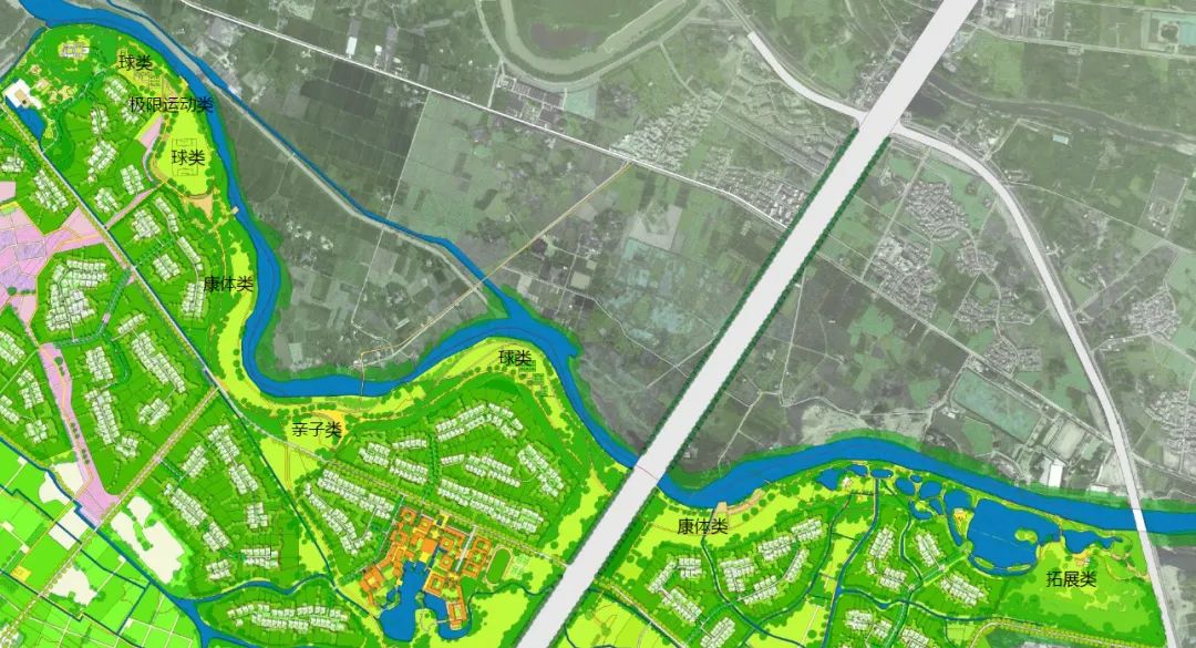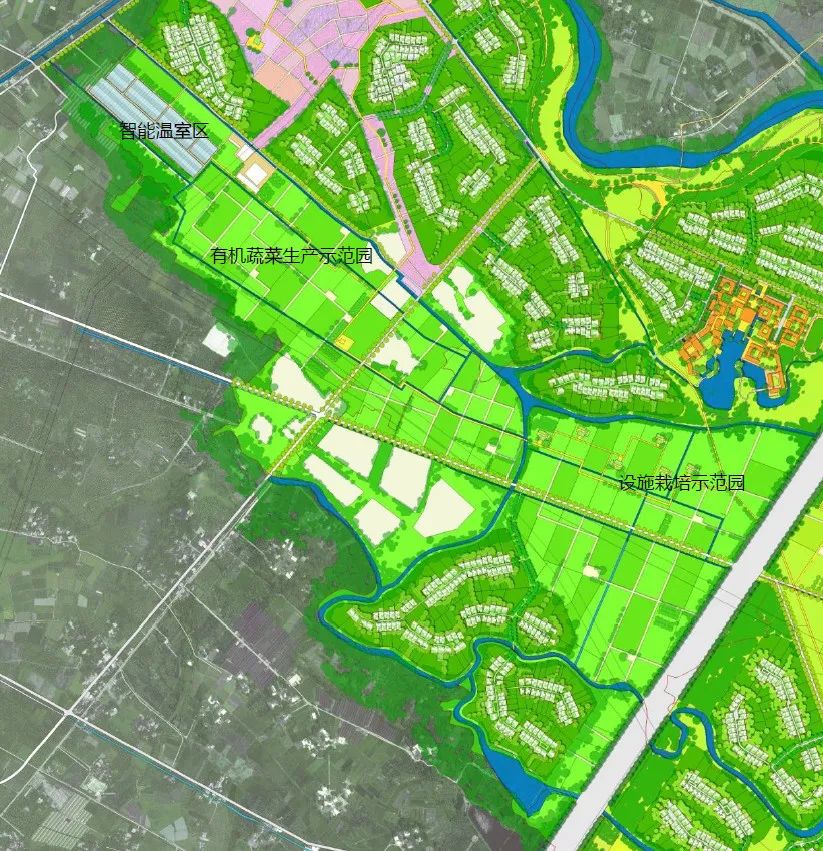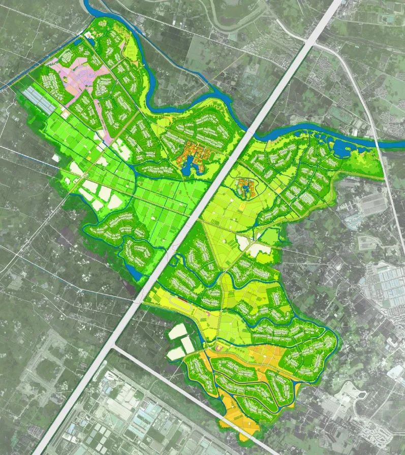 我們分片區來看,會看的更加清晰:這個片區以農業生產為主,分散的條狀用地與農業很好的結合,再加上綠城成熟的農鎮住宅產品體系,讓建設用地變成片區的配套,而不是相互之間的孤立。