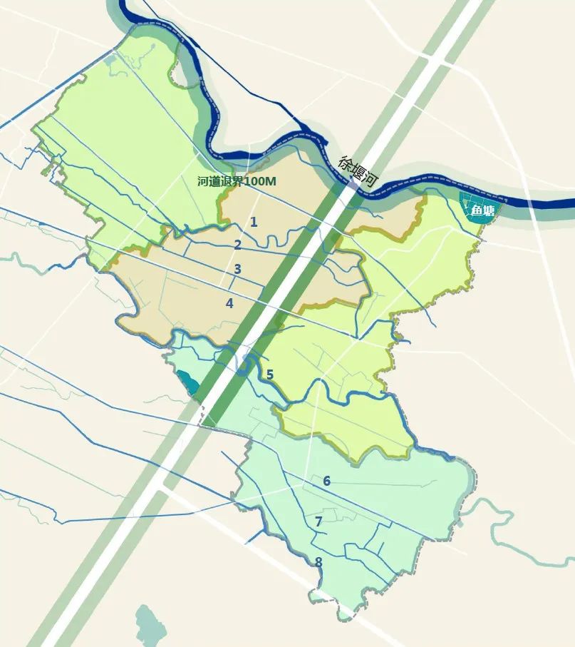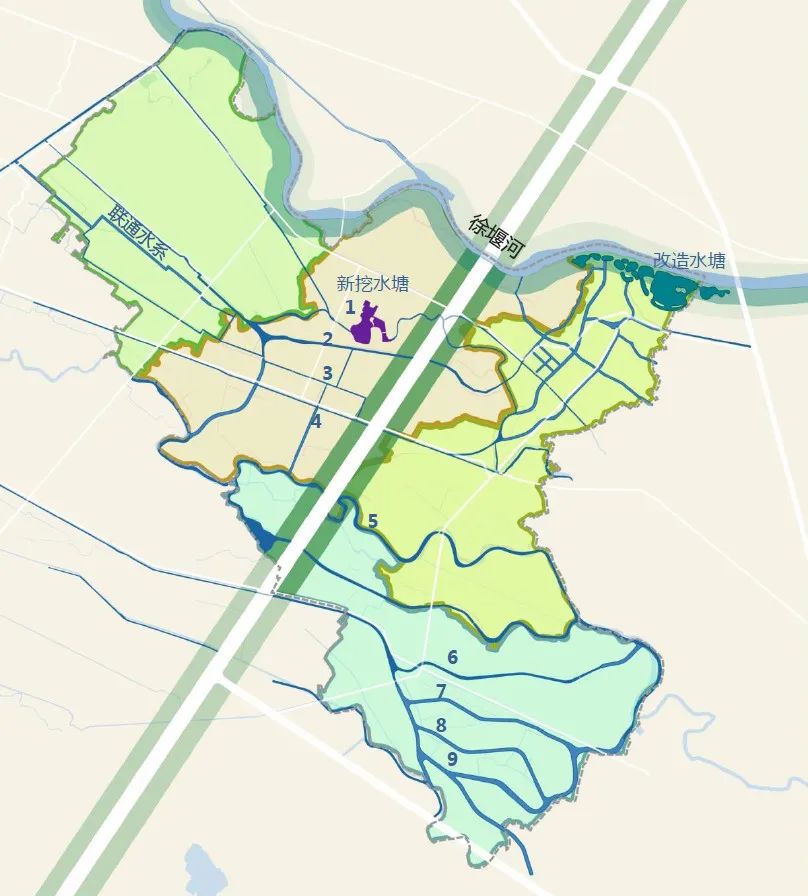 然后再來看看改造后的水系:1處增加新挖水塘,4處增加縱向連接,678處對河道進行梳理。